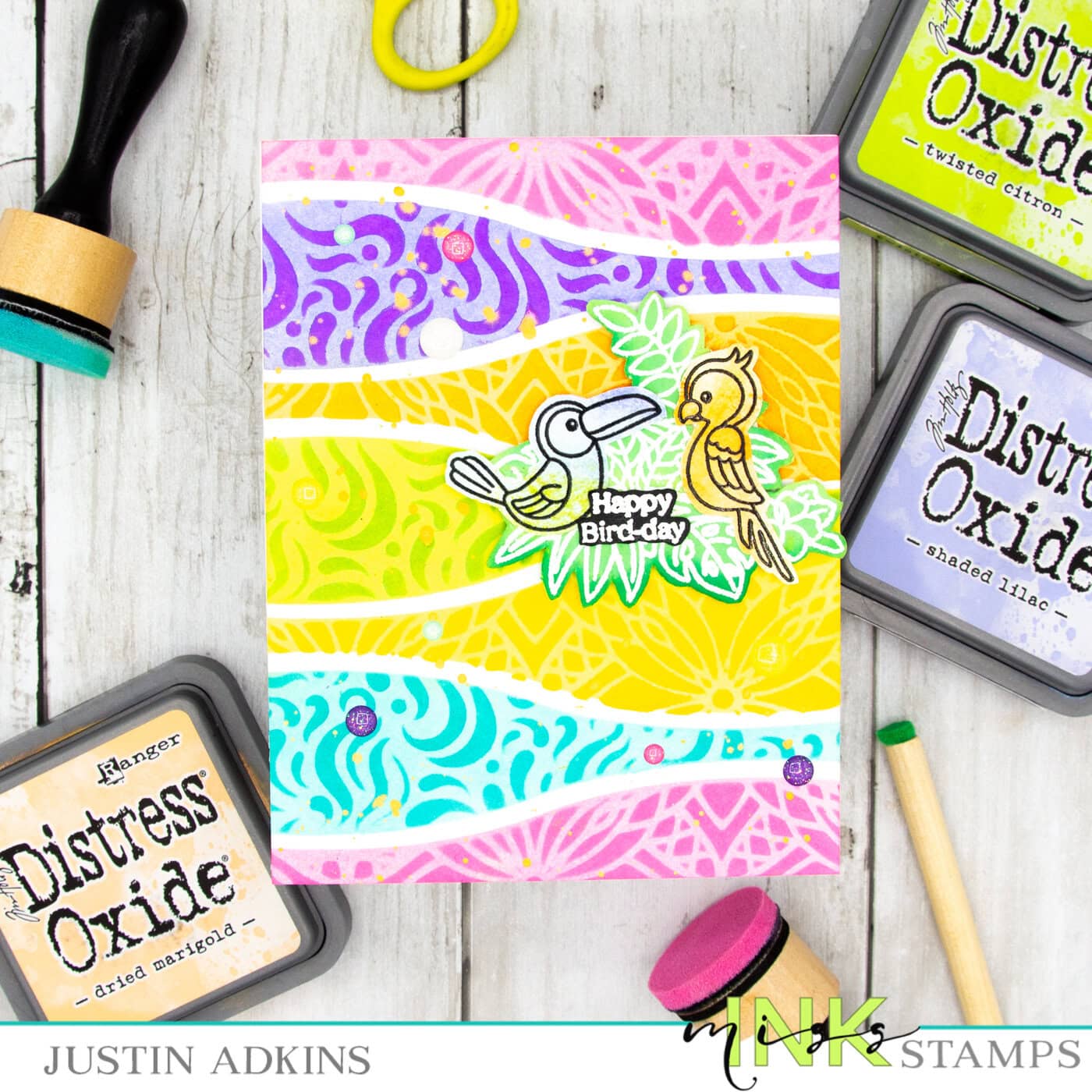 Hi everyone! Earlier tonight, I went live over in the Miss Ink’s Pad Facebook Group and used the Pretty Bird Stamp Set, along with some of the newest stencils to create this tropical rainbow card!