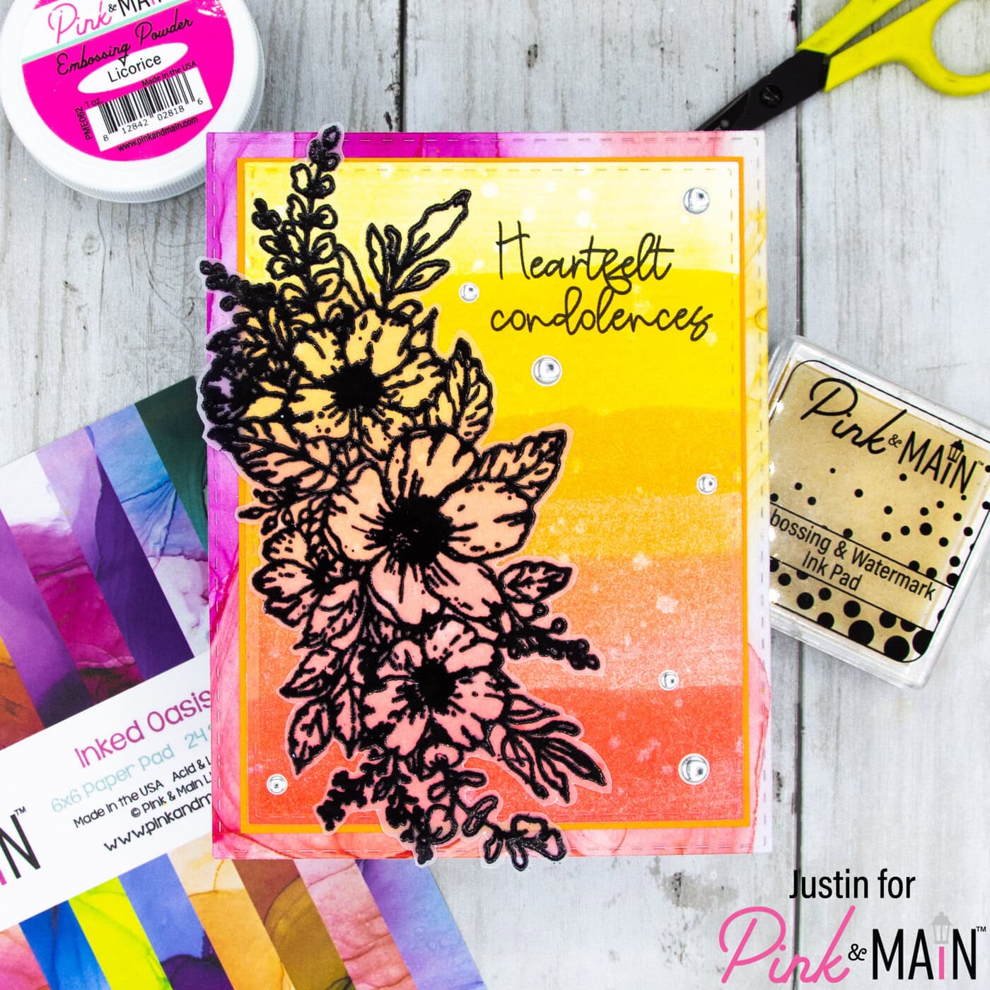 Hello everyone! Today I am sharing the type of card that nobody loves making, but we all find ourselves needing to make them from time to time: sympathy cards. And let’s also be honest, sometimes you need to make one quickly. Today I am showing off how I used the new Sketched Florals set with some of the amazing Pink & Main embossing powders to create a no-coloring required sympathy card.
