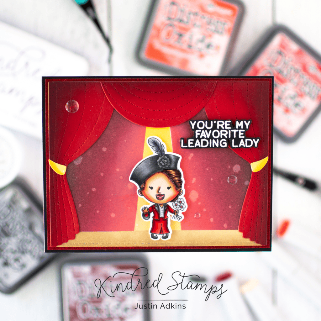 For my 3rd Leading Ladies card, I used the Humorous Lady character to create another stage scene, where she is front and center. I used the same spotlight masking technique that I used with the previous card to really put the focus on my featured character. Unlike my last card, I used red cardstock when die cutting my curtains for the stage, and distressed them to ensure that they looked like they had a shadowed edge.