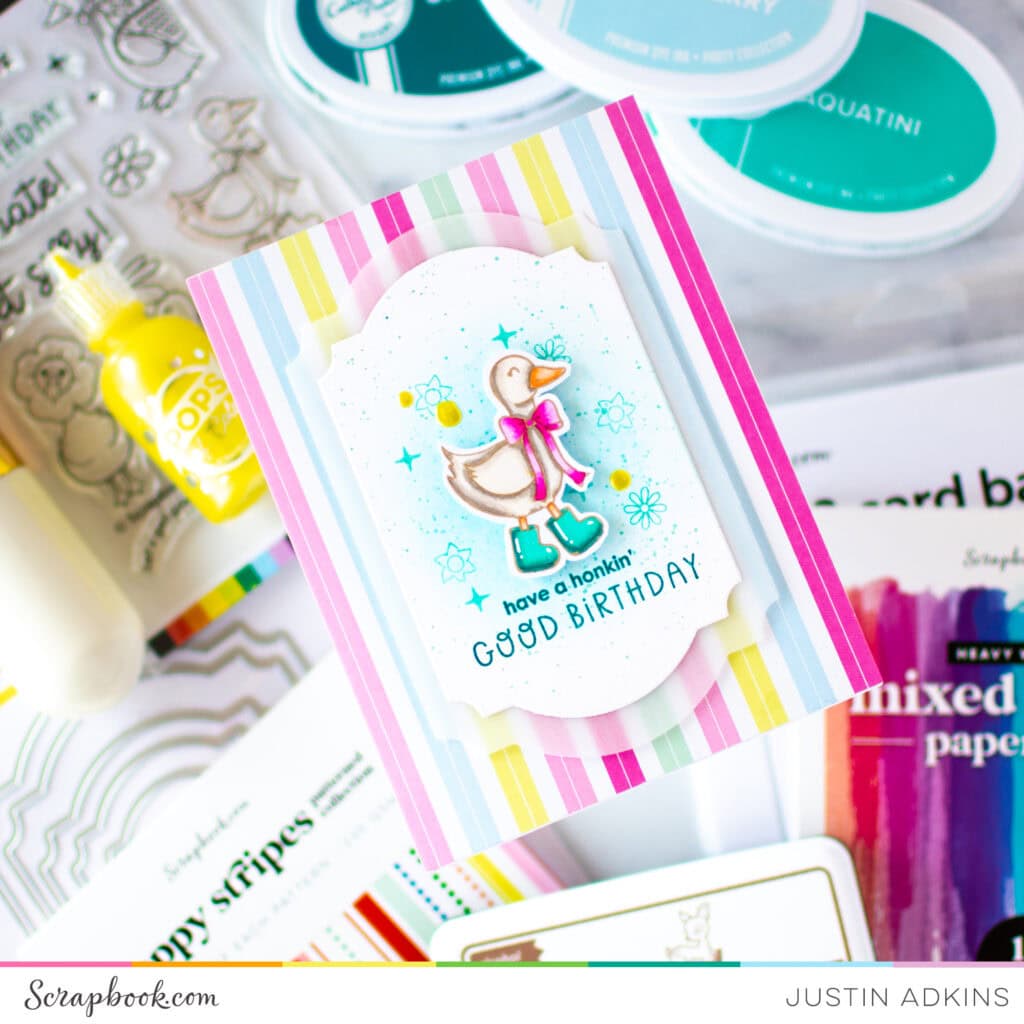 For this project, I combined the Happy Stripes Patterned Paper Pad with a simple die cut frame and vellum layer to keep the design clean while still letting those bright colors shine. The star of the show (of course!) is that honkinβ cute goose, colored up with Olo Markers for soft shading and lots of personality.